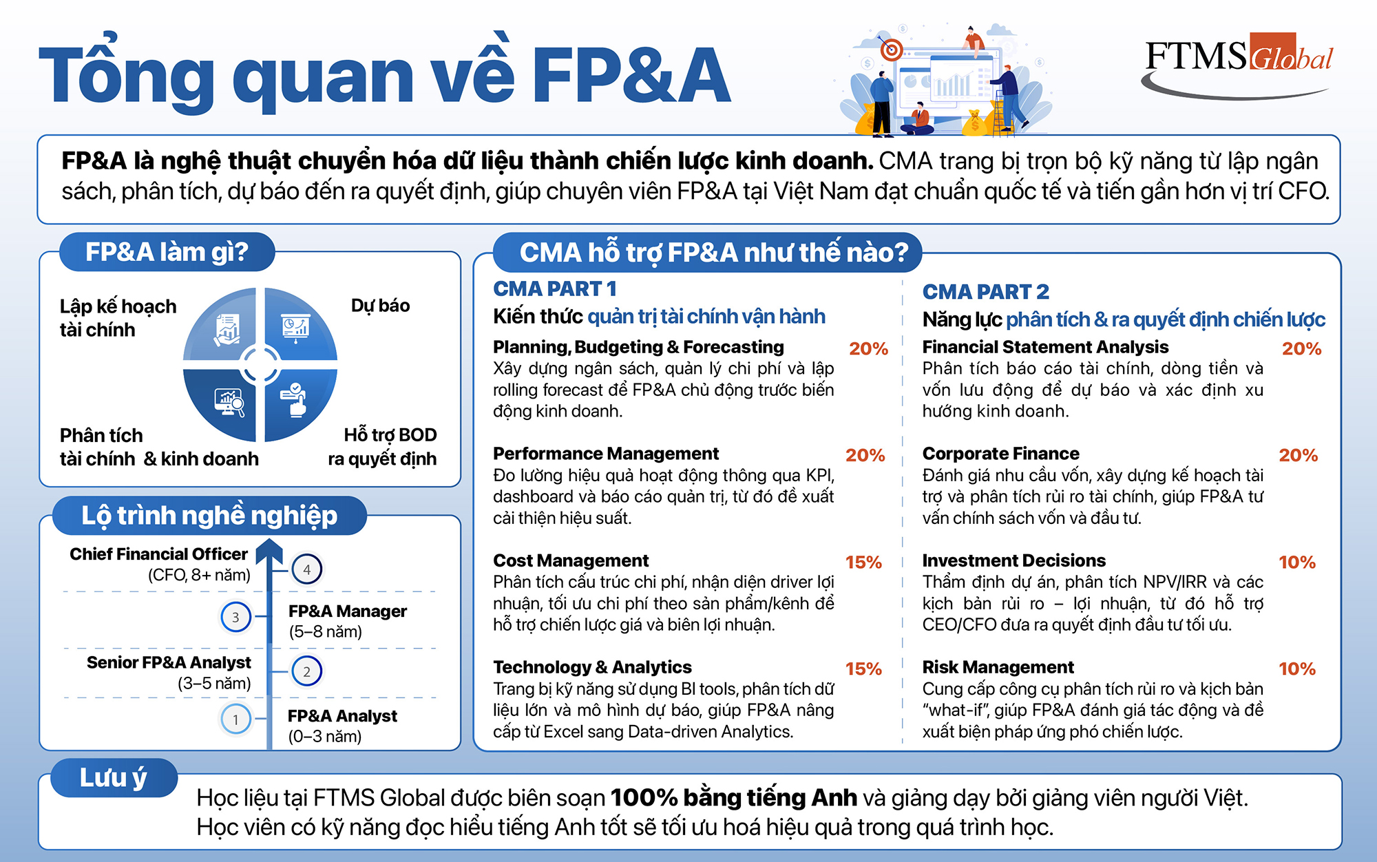 CMA không chỉ là chứng chỉ quốc tế, mà là chứng nhận năng lực tư duy tài chính chiến lược - yếu tố cốt lõi để vươn lên trong nghề FP&A. Trong kỷ nguyên dữ liệu, người hiểu con số không bằng người biết dẫn dắt con số và CMA chính là hành trang giúp bạn làm được điều đó.