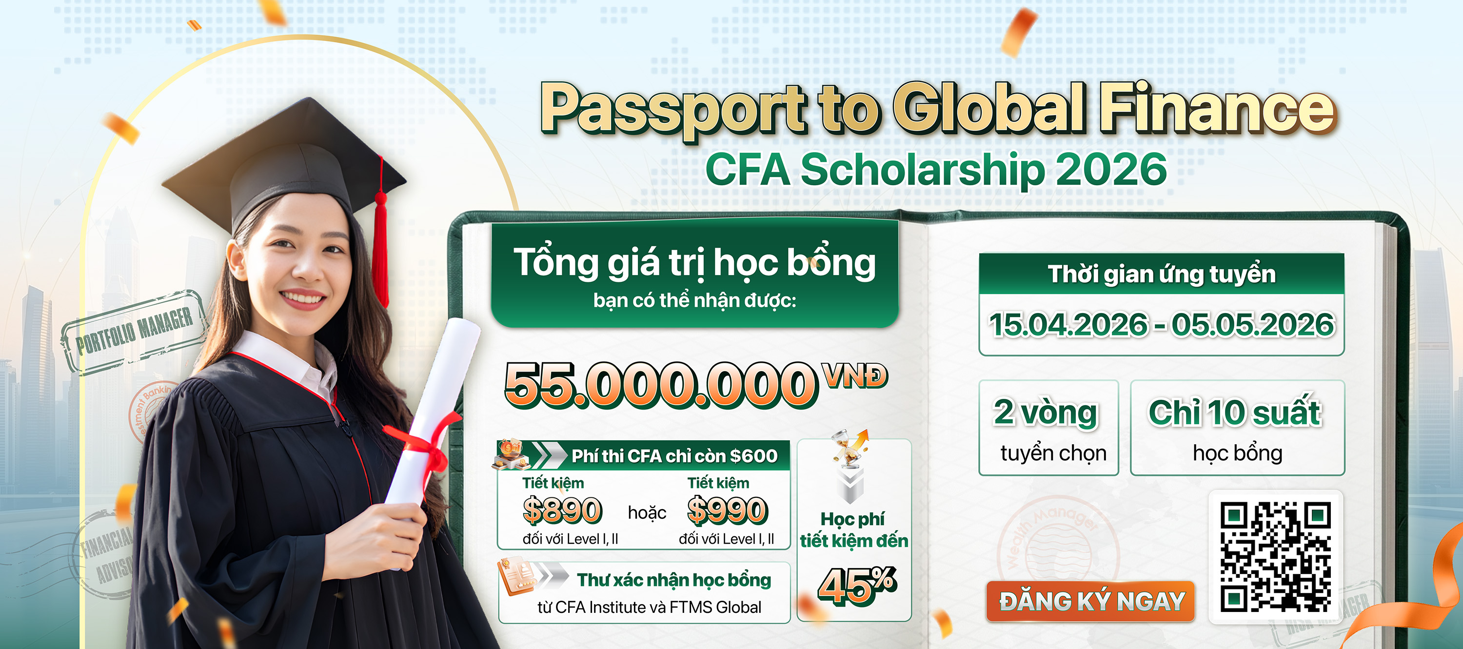 Chương trình học bổng dành cho những cá nhân nghiêm túc theo đuổi sự nghiệp trong lĩnh vực tài chính – đầu tư, với tổng giá trị hỗ trợ lên đến 55 triệu đồng.